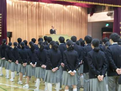 終業式の様子です。マナーとルールについて、学校だよりとリンクした校長講話がありました。3学期には、各学年とも校外学習があるため、学校の外に行く機会があります。公共機関を利用するにあたって必要最低限のルールと、他人に対して不快な思いをさせないマナーの必要性と妥当性の話がありました。自分で考え、自分で行動できる生徒になってほしいと願っています。