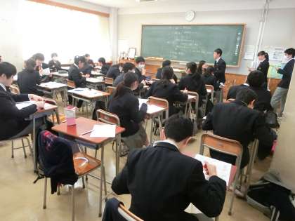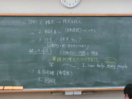 英語の授業です。演習形式で、都立高校の受検に準拠した問題を前回解きました。今日は各自でまず採点をして、辞書や教科書を使って調べます。さらに不明な点を先生に聞きに行きます。