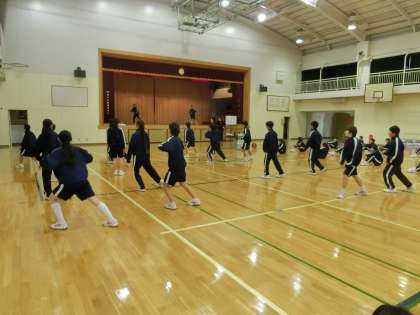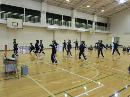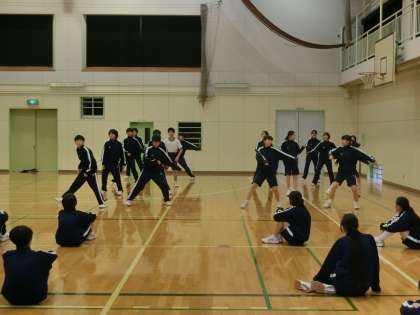 体育、ダンスの続きです。今日習ったステップを曲に合わせて総復習をグループごとにやっています。