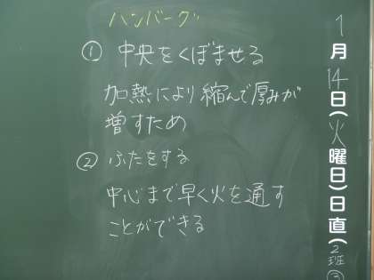 A組、家庭科です。今度調理実習があるようです。作るのはハンバーグです。みんなに一役あるのできちんと話を聞いておくようにという指示がありました。調理実習は楽しみですね。