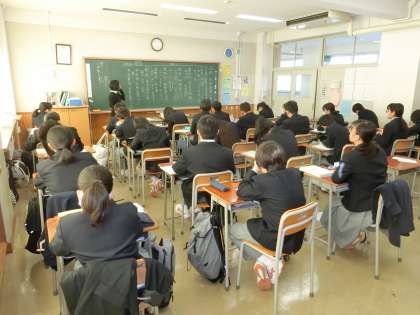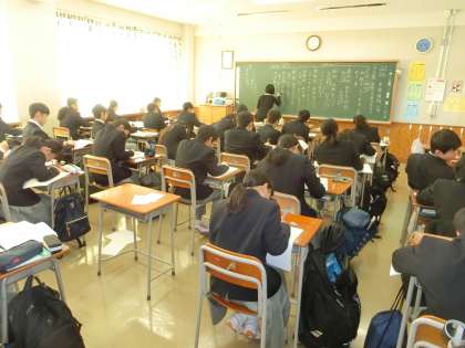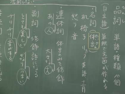 D組です。こちらは国語で、口語文法の授業です。品詞について習っています。形容動詞など日本語独特の概念があります。英語も、国語も文法をおろそかにすると、あとで取り返すのが大変です。しっかりここで習得したいものです。