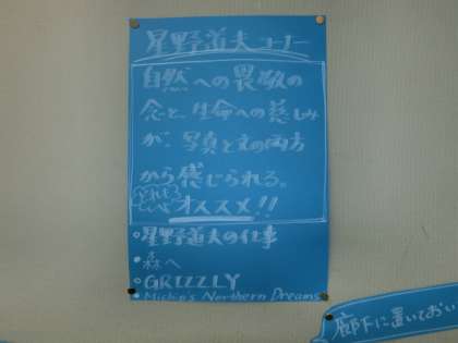 道徳の授業の畏敬の念・自然愛護のテーマでも、星野道夫さんがとりあげられていました。教員の個人の蔵書と図書館の蔵書を合わせて紹介のコーナーをつくりました。写真はとてもきれいなものです。星野さんの写真を見ると、本当に「畏敬」の気持ちがおきてきます。