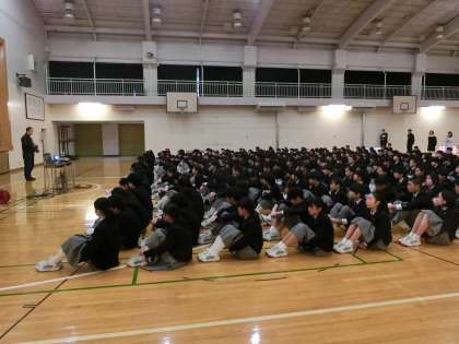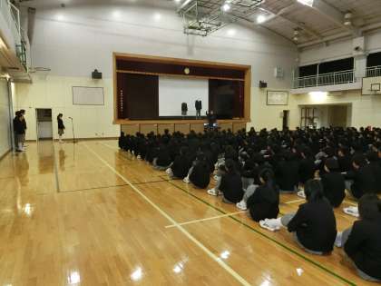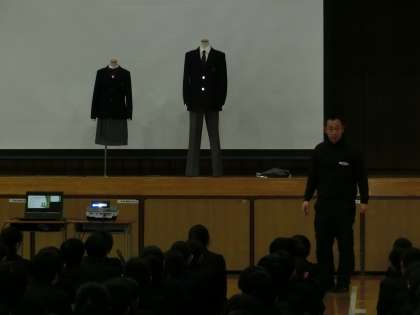 生徒会の人たちの発表と代表委員会で取り上げられた課題についての回答の後、生活指導主任から来年度の標準服についての説明がありました。