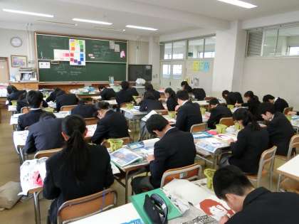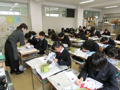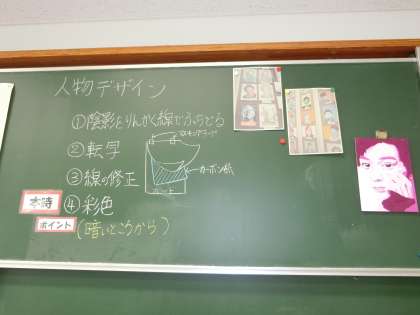 C組です。美術の授業です。顔をデザインしていく内容です。印影をうまくつけられるかがセンスが問われるのでしょうか? 難しいですが、みんななかなかいいです。