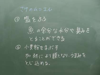 C組、家庭科の授業です。今日は、さけのムニエルの作り方を習っています。そのうちにまた調理実習があるのでしょう。塩や小麦粉はだてにふってるのではないのですね。きちんと機能があることを学びます。