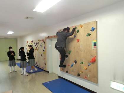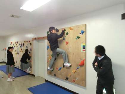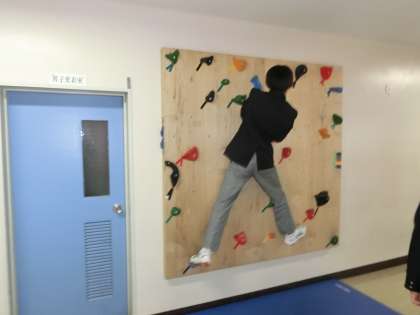 やってみると、黒(ブラック)ポイントは何とかできますが、赤(レッド)あたりからは難易度があがります。背広を破いてしまいそうなので、明日はクライミングに合わせた服装で再挑戦します。みんなも明日は上半身だけでもジャージで来ましょうね。