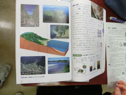 理科の授業です。地学の分野です。近年高校では、地学分野を担当できる教員が不足しています。中学の段階できちんと学習できるといいですね。3枚目は、社会の地理的分野でも学習する扇状地や三角州やV字谷のイラストがありますね。