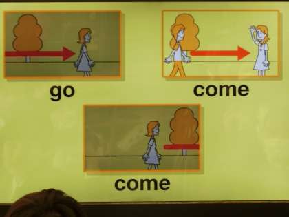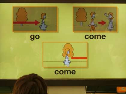 英語の授業です。映像を使ってGOとCOMEの違いを学びました。動く画像で、イメージがつかみやすかったのか、わかりやすいです!と多くの生徒が感動の声を発していました。