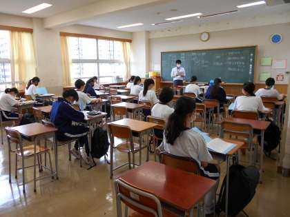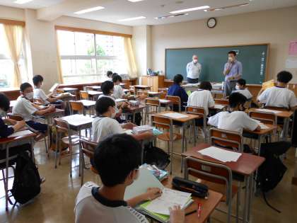 英語の授業ではALTが入り進められていました。A・B・C組では体育の授業があり、ストレッチなど行っていました。あと終わりには、手洗いうがいをその場でする支持がありました。理科では、2人体制で授業が行われていました。