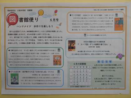 6月「ほけん」だより・図書館便りから 公開日 2020/06/12 更新日 2020/06/12 学校日記 今週、ほけんだよりが配られています。ご覧になられたでしょうか。健康調査の様子や学校生活での注意や「ウイルスの3つの顔を知ろう」などの情報が記載されています。ぜひ目を通していただければと思います。また図書館便りも配られています。図書館の利用は安全対策を講じたうえで22日より少しずつ活動を再開していきます。待っていいた人も沢山いるのではないでしょうか。のぞいてみてください。 いいね(0)