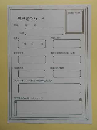 3年生の教室の横壁面に「自己紹介カード」が掲示してあります。みんなそれぞれの思いが記入されています。3年生にとってみればこれから幾度となく自己紹介や自分の長所など示していかなくてはいけない場面が出てくると思います。自分の中でいつでもPRできるように準備をしておきましょう。