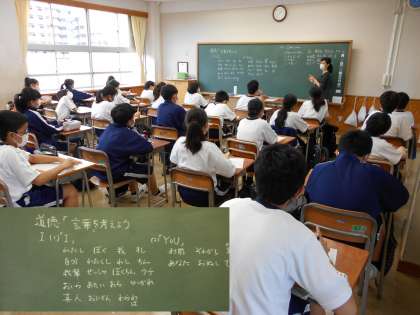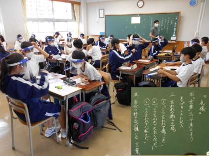 1年生、5時間目は道徳の時間です。「言葉を考えよう」にという題材で、教材を使いながら“礼儀”について学習しました。問いかけに対してたくさん手が挙がり、班での話し合い活動も充実していました。