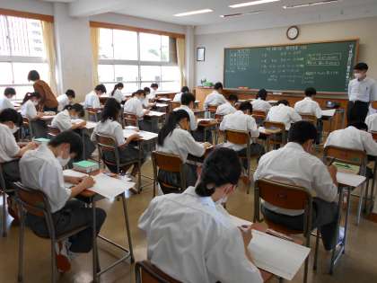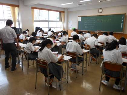 中学校で受ける初めての定期考査です。多少緊張感が感じられます。いざ始まると、不安からか質問の手が挙がっていました。最後までしっかりと問題を読み、解答方法確認しながら進めていきましょう。