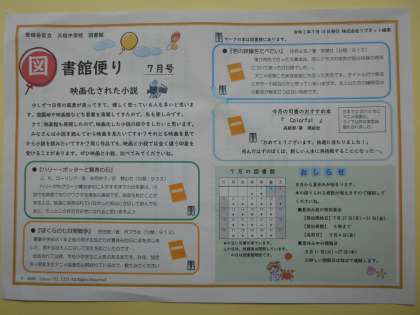 先日、図書館便り7月号が配布されました。今回は映画化された小説の紹介です。映像と文字(文章)の違いを比べてみるのも面白いかもしれません。また、夏休みに向けて特別貸し出しもあります(一人5冊まで)。利用してみてください。