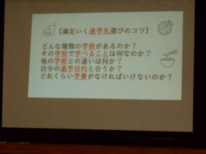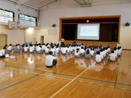 3年生は、1時間目に体育館で全体に進路について栃木教諭より説明がありました。進路先・高校の選び方について、ラーメン屋さんの例にポイントを確認、さらに「行きたいのか」「行きたくないのか」そして「行けるのか」「いけないのか」の話へと進んでいきました。自分の進路先は、周りと相談しながら自分で決めていくことになります。前向きにとらえてほしいと思います。