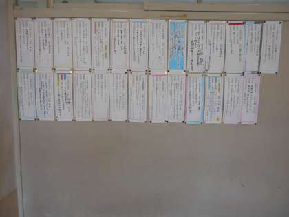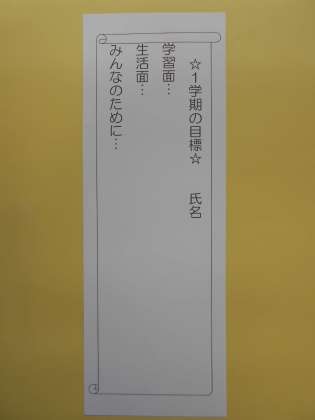 「学習面・生活面・みんなのために」という3つの項目で書かれています。学習面:先生の話をしっかり聞く、数学と英語を頑張る、苦手教科を作らない、授業に集中するなど、他にも具体的な数字でテストで何点以上取るや成績のことを描いている人もいました。生活面では、遅刻をしない、忘れ物をしない、早寝早起きなどが多く中には計画的に行動、スケジュール管理をしっかりするという人も。みんなのために・・:仲良く、気遣い、協力、掃除を頑張る、言葉遣いに関することなどがありました。自分でも常にこの目標を達成できているか振り返ってみましょう。