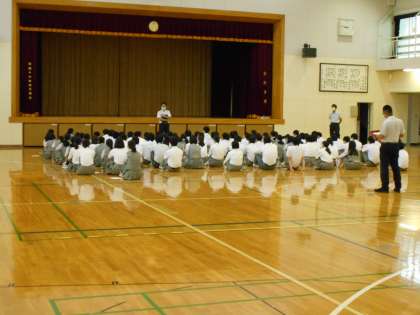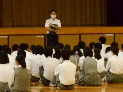 3年生はこれからの進路について体育館で話がありました。進路指導主任より高校説明会の参加の方法や推薦基準についいて細かく説明がありました。