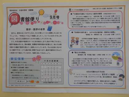 図書館だより より 公開日 2020/09/08 更新日 2020/09/08 学校日記 今回の特集は、「数字・数学の世界」です。紹介されている本は図書館に新設コーナーとしてありますので、是非ご利用くださいください。また、9月の新刊本も貸し出しを行っていますのでのぞいてみてください。 いいね(0)