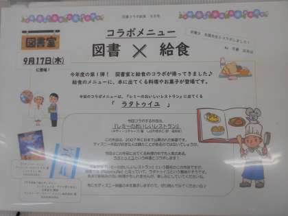 今日は「ラタトゥイユ」です。図書室と給食室のコラボ企画で、映画にもなったディズニーの『レミーのおいしいレストラン』に登場するメニューです。視覚だけではなくにおいや味で体感できるとさらに作品が楽しめますね。