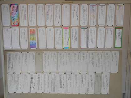 教室には2学期の目標が貼ってあります。今回も学習面、生活面そしてみんなのためにと3項目で書かれています。ノートまとめて見やすくする、上手に時間を使う、テストで良い点を取る、時間を守って行動、あいさつをする、部活動をしっかり取り組む、進んでいろいろな仕事をする、他人の話をよく聞くなどそれぞれの思いと意欲が伝わってきます。