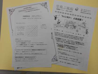 図書委員会企画のビンゴスタンプラリーが7日(水)から行われています。本を借りてスタンプをもらい、委員会からのクイズに挑戦します。チャレンジしてみてください。また、「ファンタジー人気投票」も同時行われています。