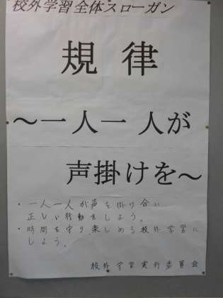 廊下に先日決めた校外学習スローガンが貼り出されています。これからこのスローガンを基に活動を進めていきます。行事を終えた時の成長を楽しみにしています。