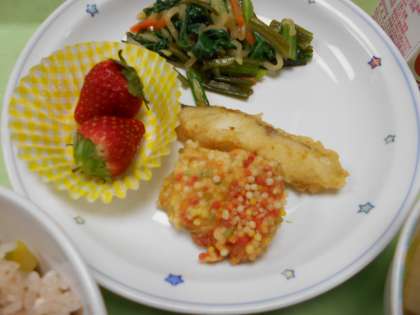 金目鯛食べました 公開日 2021/01/12 更新日 2021/01/12 給食 今日は新春献立でした。 お雑煮のお餅も調理室で捏ねてつくりました。 金目鯛は小さいものでしたが高級魚です、 生徒たちも味わってくれたでしょうか。 主な食材の産地 小松菜・・・埼玉 ダイコン・・・神奈川 ニンジン・・・千葉 白菜・・・茨城 ネギ・・・千葉 イチゴ・・・栃木 柚子・・・高知 スケソウダラ・・・ロシア 金目鯛・・・東京 鶏肉・・・岩手 米・・・秋田 いいね(0)