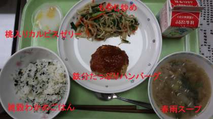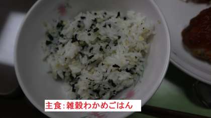 今回の給食は家庭科の授業で取り組んだ献立です。1月は3年A組の各班が考えたメニューの登場です。今日は“パンパース班”の献立です。主食は雑穀わかめごはんです。鉄分やカルシウムの入ったバランスの良いメニューです。