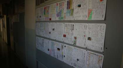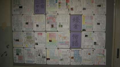 2年生の廊下には鎌倉校外学習の事前学習が掲示してあります。一人1テーマを新聞形式でまとめています。レイアウトや色づかいなど工夫がみられます。