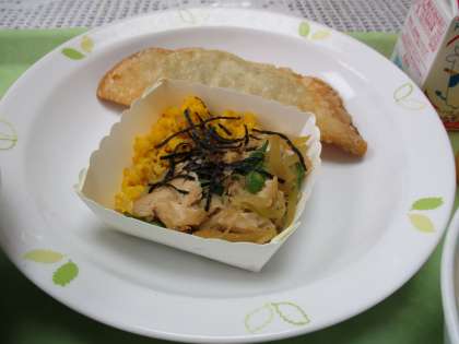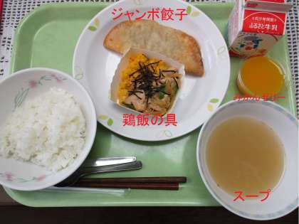 今回は、3Aすみけし班の鶏飯です。主食の鶏飯は、鹿児島の奄美大島の郷土料理でもあります。お祝いや、おもてなしするときに食べられるそうです。好評判のジャンボ餃子がつきます。実際は具材をごはんに載せスープをかけます。