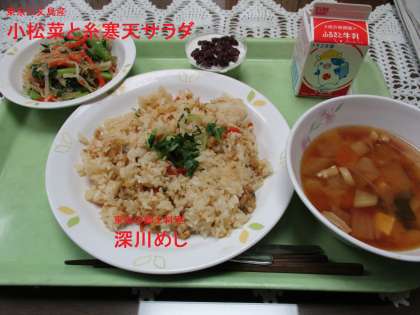 今回のオリンピックパラリンピック給食は、日本・東京です。東京にも数々の名物がありますが、今日は“深川めし”です。お弁当でも売られている有名なごはんです。サラダにも八丈島産糸寒天が使われています。