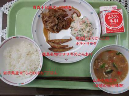 今回は、東北地方にゆかりのある郷土料理 “東北ざんまい”です。青森十和田のバラ焼き、山形の納豆汁(宮城の仙台味噌)、秋田いぶりがっこのポテトサラダ、福島名物ワカサギのから揚げ、ごはんは岩手県産米のひとめぼれです。