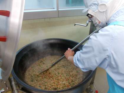 給食室ではチーフが丁寧にガパオ作りを担当して
