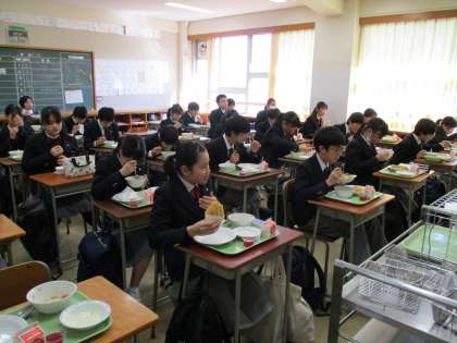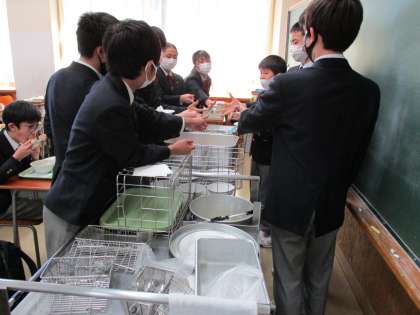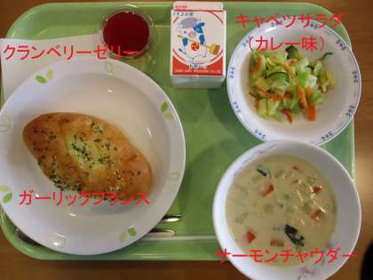 今日は、2Dのリクエスト給食です。リクエストは「ガーリックフランス」。牛乳たっぷりのサーモンチャウダーとキャベツサラダ(カレー味)、デザートにクランベリーゼリーがつきます。サーモンチャウダーは、鮭とアサリのうま味たっぷりです。 ガーリックフランスにはおかわり希望者が多数!