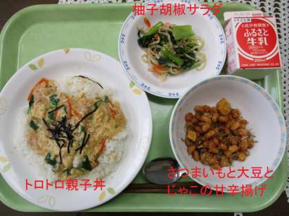 家庭科とのコラボ給食 公開日 2021/02/17 更新日 2021/02/17 学校日記 3Cの幻のダクサーズ☆班。主食は、トロトロ親子丼です。それに柚子胡椒サラダとさつまいもと大豆とじゃこの甘辛あげです。ふわっと仕上がった親子丼です。 いいね(0)