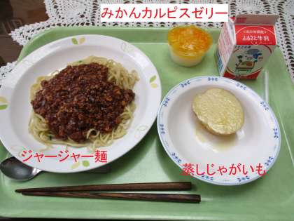 今日は、3CSummer Festival班のジャージャー麺です。蒸しじゃがいもとみかんカルピスゼリーが付きます。大豆の触感も少しピリ辛のジャージャー麺は食欲が増します。じゃがいもは水分の多く皮のやわらかい新じゃがです。