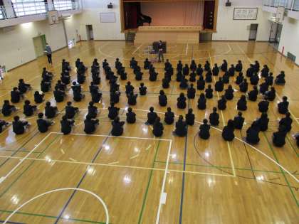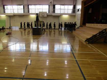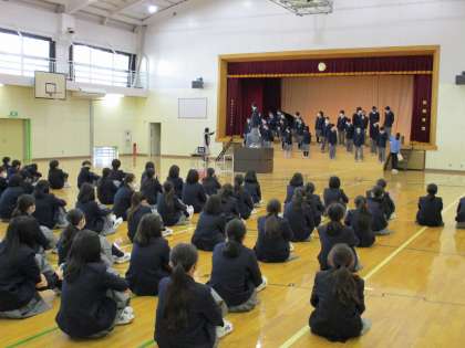 5時間目に1年生は合唱のリハーサルを体育館で行いました。今回は入退場の練習を行い、体育館で初めてステージに並んでみました。