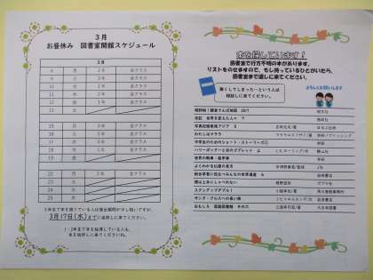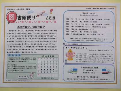 「未来の自分、明日の自分」と題してこれからあらたな生活に向けて心の整理についてメッセージが書かれています。3年生は大きく生活が変わりますが、1・2年生もひとつのくぎりのこの時期に心の整理をしてみるといいかもしれませんね。イベントも開催しています。