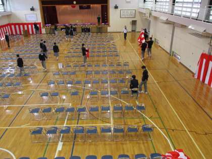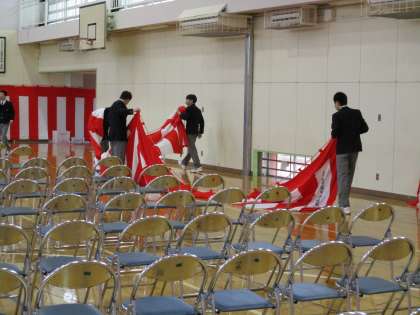明日の入学式に向けて、在校生で準備を進めました。会場は3年生が中心となり設営を行いました。