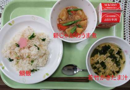 お祝い給食第2弾 公開日 2021/04/09 更新日 2021/04/09 学校日記 昨日に続いて、入学・進級お祝いメニューです。今日は、鯛めし・若竹かきたま汁・新じゃがのうま煮です。鯛は、おめでたい席でよく出てきますね。 いいね(0)