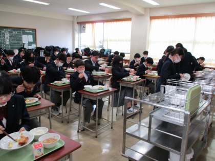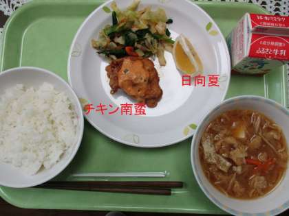 郷土料理給食、宮崎県のチキン南蛮です。なんといっても名物です。キャベツのおかか和え、切り干し大根の味噌汁、日向夏がデザートでつきます。日向夏も有名ですね。