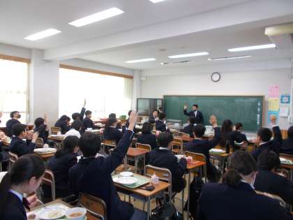 みんなに声をかける保健給食委員さん、給食時間は忙しいと思いますが