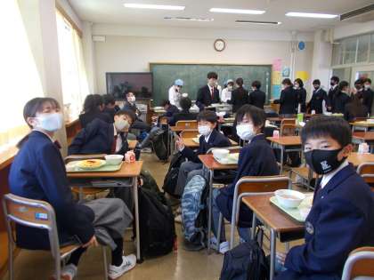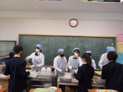 今日もおなかペコペコ、いただきますが待ち遠しい1年生の準備のようすです。