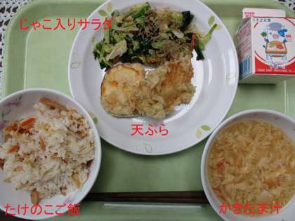 給食はたけのこご飯 公開日 2021/04/27 更新日 2021/04/27 学校日記 旬の筍をつかったたけのこご飯です。香りや歯ごたえは新鮮な今が最高です。天ぷらとじゃこ入りサラダ、かきたま汁と一緒に味わいます。 いいね(0)