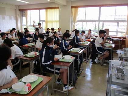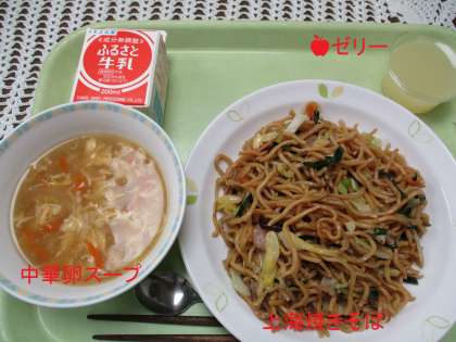社会科とのコラボ給食 東アジアのごはんとして中国から上海焼きそばと中華卵スープです。見た目はソース焼きそばに見えますが、オイスターソースが使われています。中華料理には大切な調味料のひとつです。