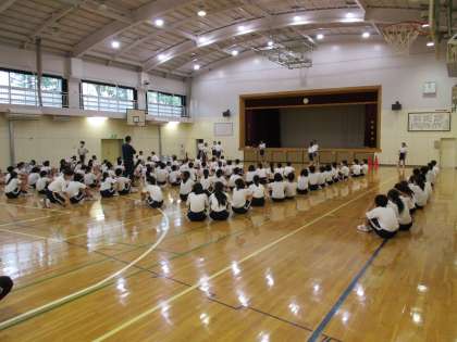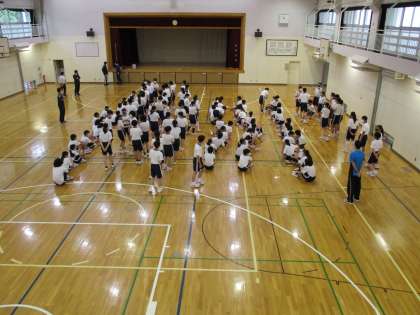 今日は、3年生と1年生の学年練習でした。あいにくの雨でしたが体育館で行いました。3年生は実行委員を中心に全員リレーの走順の確認を行っていました。
