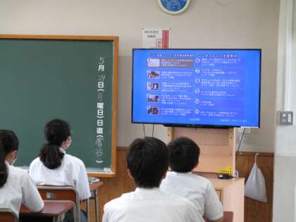生徒会朝会で 公開日 2021/05/24 更新日 2021/05/24 学校日記 今回の生徒会朝会で生徒会が中心となって行うユニセフ募金について説明がありました、リーフレットとともに動画を視聴しました。 いいね(0)