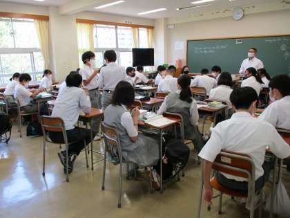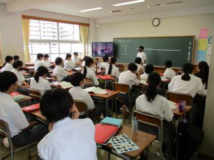 ALTのフランク先生は、各学年の授業にスピーチの指導やペアワークなど様々な形で関わっています。