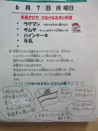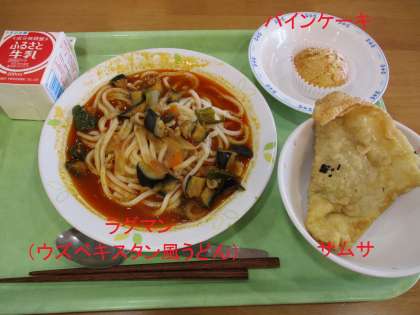 今日の給食は 公開日 2021/06/07 更新日 2021/06/07 学校日記 アジア料理シリーズ。今回は中央アジアのウズベキスタン料理です。その中から“ラグマン”“サムサ”とそれにパインケーキです。 いいね(0)