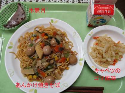 あんかけ焼きそば、キャベツのゴマ風味、デザートに京都の伝統的なお菓子“水無月”がつきます。